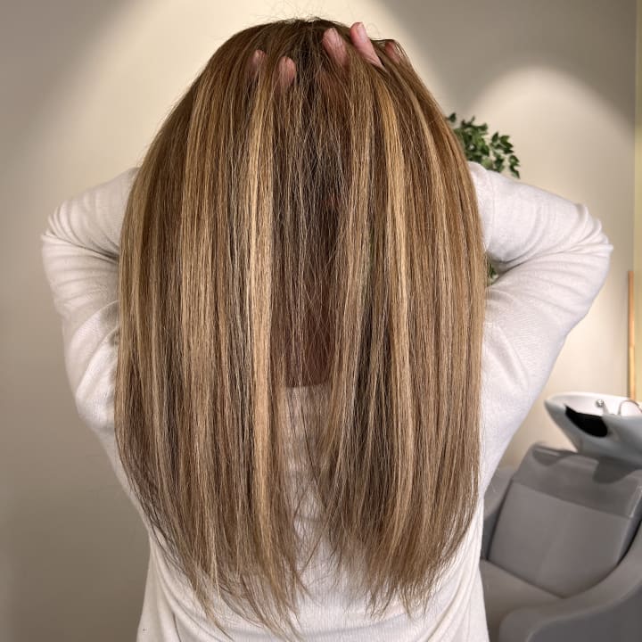 Striper og klipp, hårlengde som strekker seg under skulderbladene. Vask og føn inkludert.